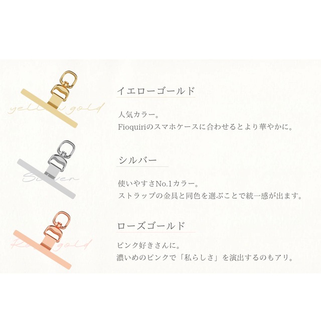 高級感と華やかさのある 金属製スマホ・ホルダー。 「透明のプラスチック製ホルダーは切れやすい…」 そんなお悩みをお持ちの方もいるのでは? 金属製ホルダーであれば、 切れてスマホが落下…!! のリスクを軽減でき、とても安心感があります。 Fioquiriのスマホケースにもとっても好相性。 ケースがより華やかになります。 《 3色よりお選びください 》 ・イエローゴールド ・シルバー ・ローズゴールド おすすめPoint プレート幅が狭いので、カードなど一緒に 挟みやすいです。